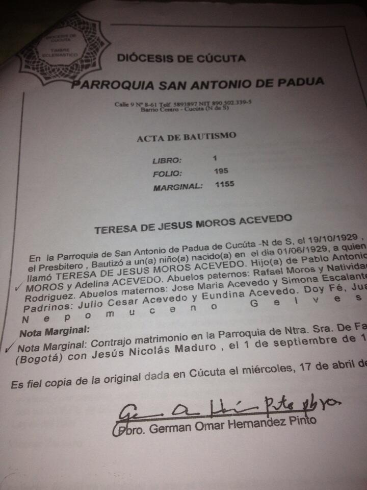 El diputado de la Asamblea Nacional, Abelardo Díaz, luego de indagar en el pasado de la familia Maduro- Moros, para sorpresa de hizo pública, la presentación de documento obtenidos, que reseñan el lugar de nacimiento de la progenitora del Mandatario Nacional, “señora Teresa de Jesús Moros de Maduro nació en Cúcuta, Colombia el 01 de Junio de 1929”.