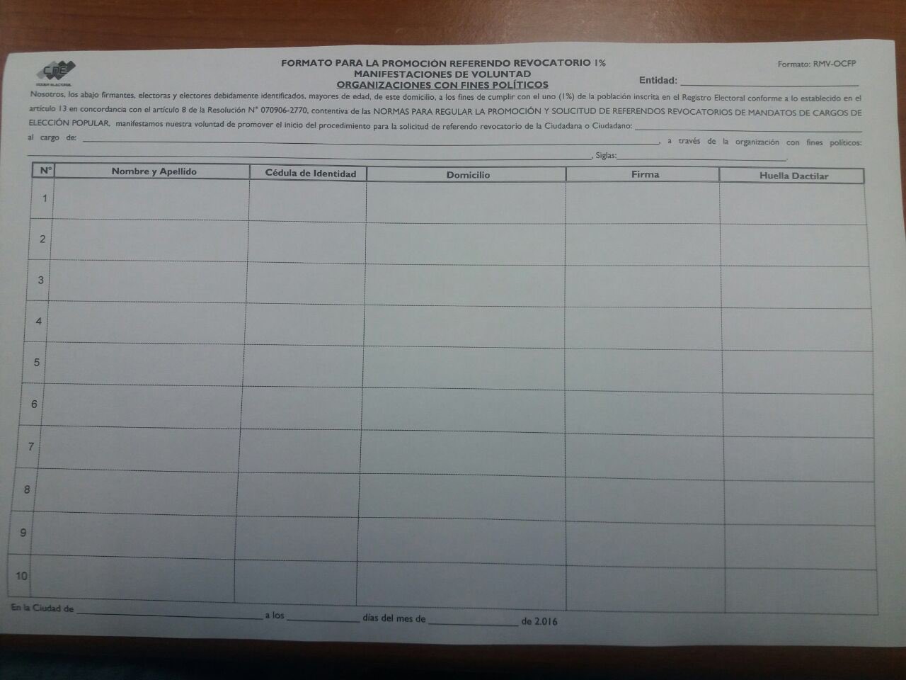 La tarde de este martes 26 de abril varios líderes opositores venezolanos dieron a conocer la información de la entrega por parte del Consejo Nacional Electoral de la planilla para recolección de firmas para solicitar el referendum revocatorio en contra del presidente Nicolás Maduro.