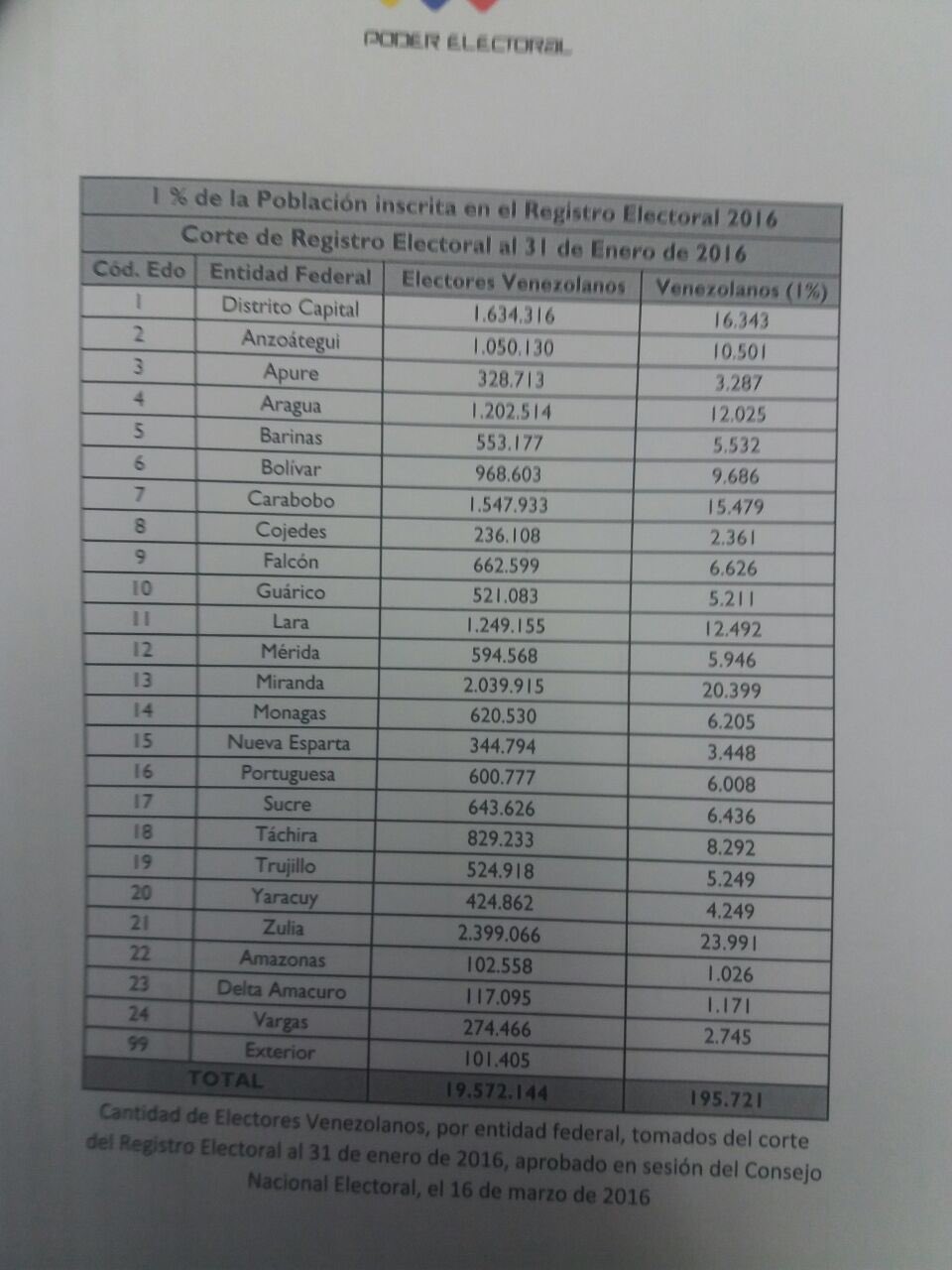 Al mismo tiempo, el gobernador de Mirando publicó un listado en el que muestran la cantidad de firmas por estados necesaras para activar el referendum.